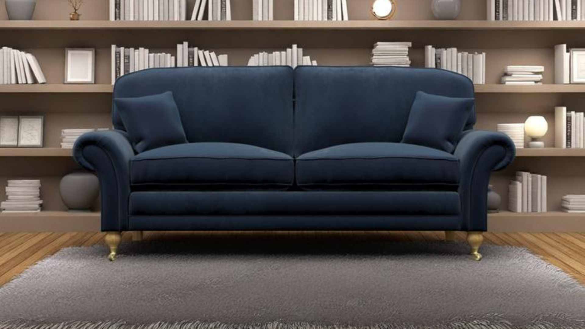 A classically elegant sofa with generous scroll arms and deep cushioned seats.